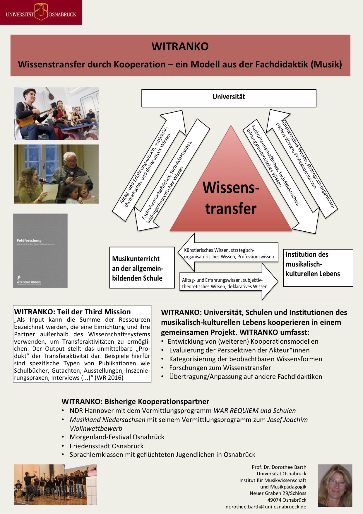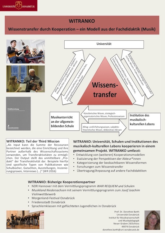 Im Lehrmodell WITRANKO (Wissenstransfer durch Kooperation) kooperieren drei Partner: ein musikdidaktisches Seminar an der UOS, Osnabrücker Schulen sowie eine Institution des gesellschaftlich-kulturellen Lebens. Durch die Kooperation der drei Partner werden Räume für einen dreifachen Wissenstransfer geöffnet. Zudem können zentrale Aspekte in der Lehrer:innenbildung konstruktiv bearbeitet werden: Es können Impulse für die Unterrichtsinhalte des Musikunterrichts gegeben und beidseitig begehbare Brücken zwischen universitärer Theorie und schulischer Praxis gebaut werden. Durch die Beteiligung der Institution des gesellschaftlich-kulturellen Lebens (z.B. Museen, Festivals, NDR, Theater) werden Themen des »wirklichen Lebens« zu Inhalten in der Lehrer:innenbildung und im Musikunterricht; die Institutionen werden zum Regulativ zwischen den Zielvorstellungen theoriebezogenen und praxisbezogenen Wissens.