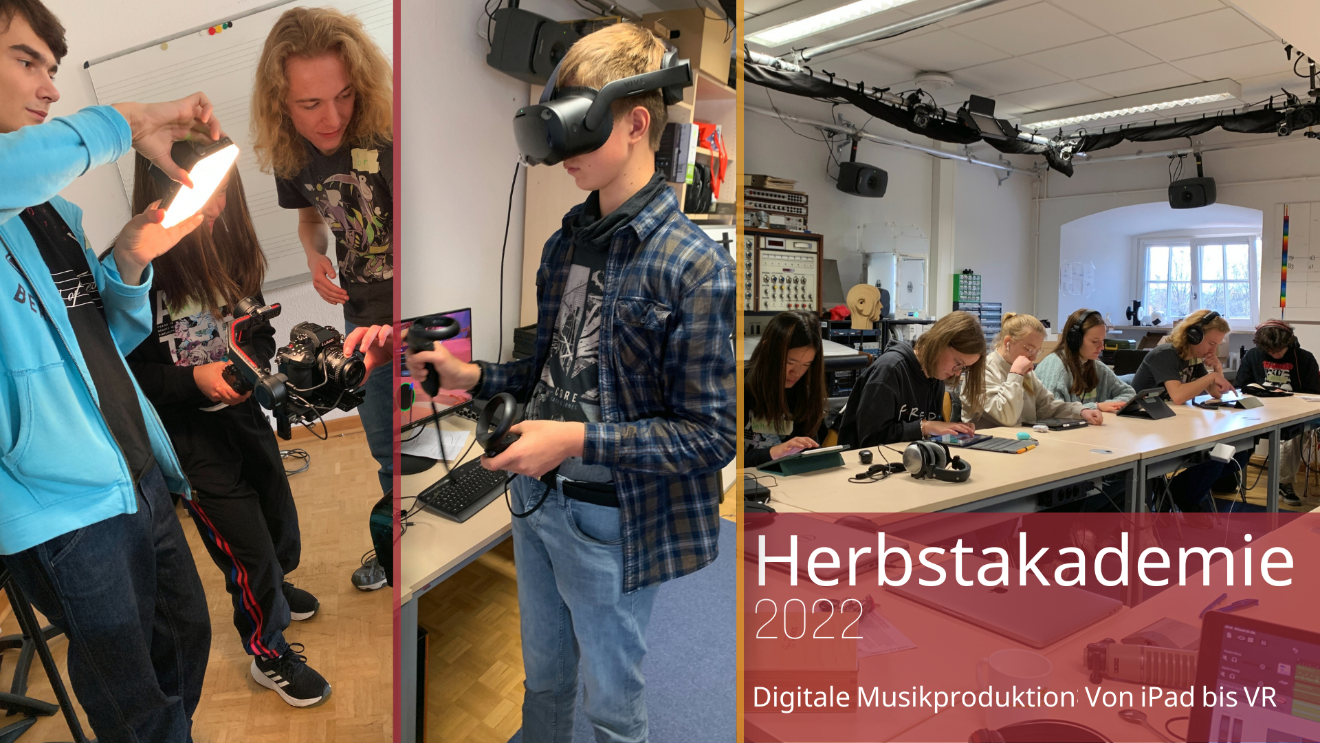 As part of the Herbstakademie 2022, eight students worked for three days in the IMM recording studio and the MTDML lab on the topic of "Digital Music Production: From iPad to VR." As an introduction, various types of microphones and the basics of DAW work were discussed. Following on from this, musical ideas could be explored using tablets and experiments with sounds could be carried out on an individual basis. Subsequently, in the area of recording and producing, own recordings were planned, recorded and post-processed. In line with this, the young people were able to create their own music video using professional cameras, gimbals and editing software. Finally, they combined image and sound and discussed and finalized the product together. As a preview of future possibilities in music and media production, the course was able to try out virtual instruments with VR glasses. The independent final presentation of the process and the results took place at the Kreishaus Osnabrück.