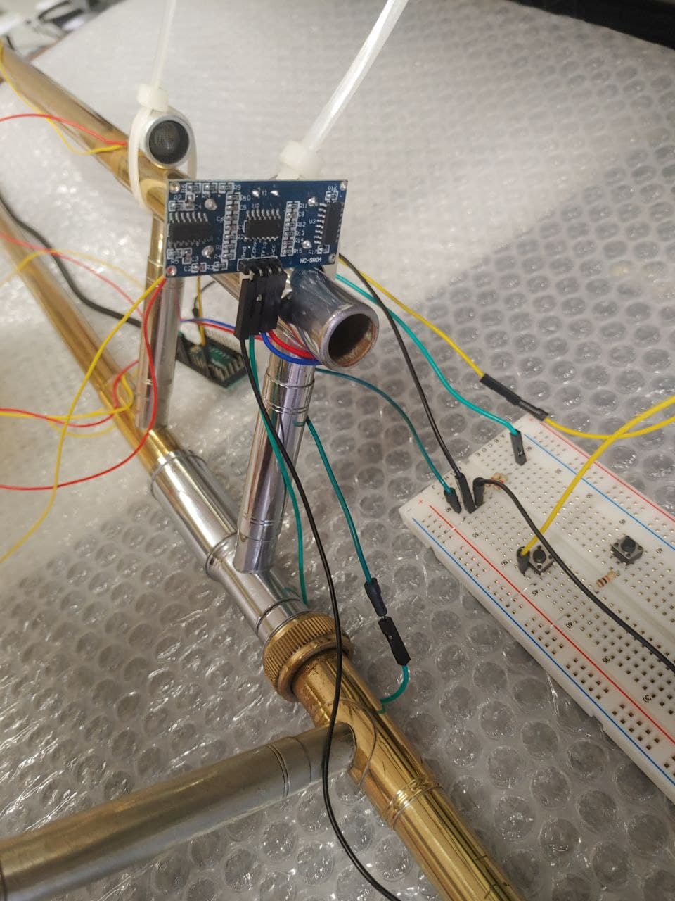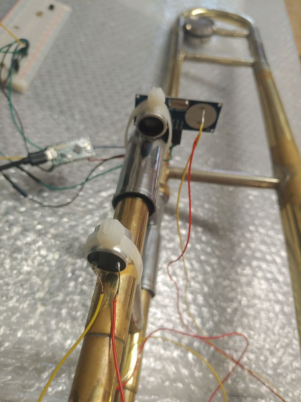 Instead of the player's lips, the sound is generated by a self-written program: the positions or movements of the trombone slide detected by an ultrasonic sensor are converted into MIDI notes of the corresponding pitch, which in turn trigger trombone notes played by the seminar participants.